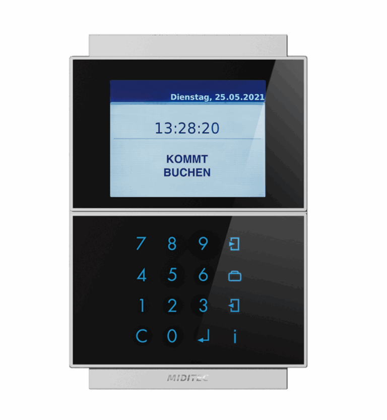 Time recording terminal for online and offline use with contactless RFID reader technology. The terminal is available for MIFARE Classic and DESFire EV1 readers, as well as LEGIC prime and advant readers. It features a silver casing and a black control panel with a keypad and TFT display. Connection to a server or PC is via Ethernet, and power is supplied via PoE.