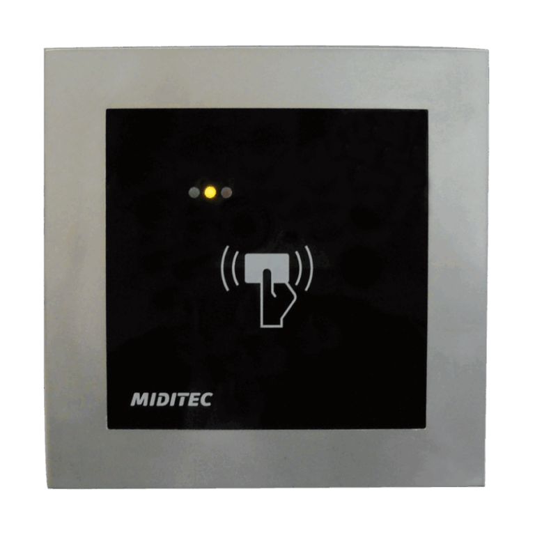 Aufzugsleser mit berührungslosem MIFARE/LEGIC-Leser. Der Leser hat eine RS485- Schnittstelle zum Anschluss an eine EL7000/x Aufzugszentrale. Er wird in ein Aufzugstableau eingebaut. Über die LEDs werden Statusanzeigen zur Berechtigung der gelesenen Karte angezeigt.